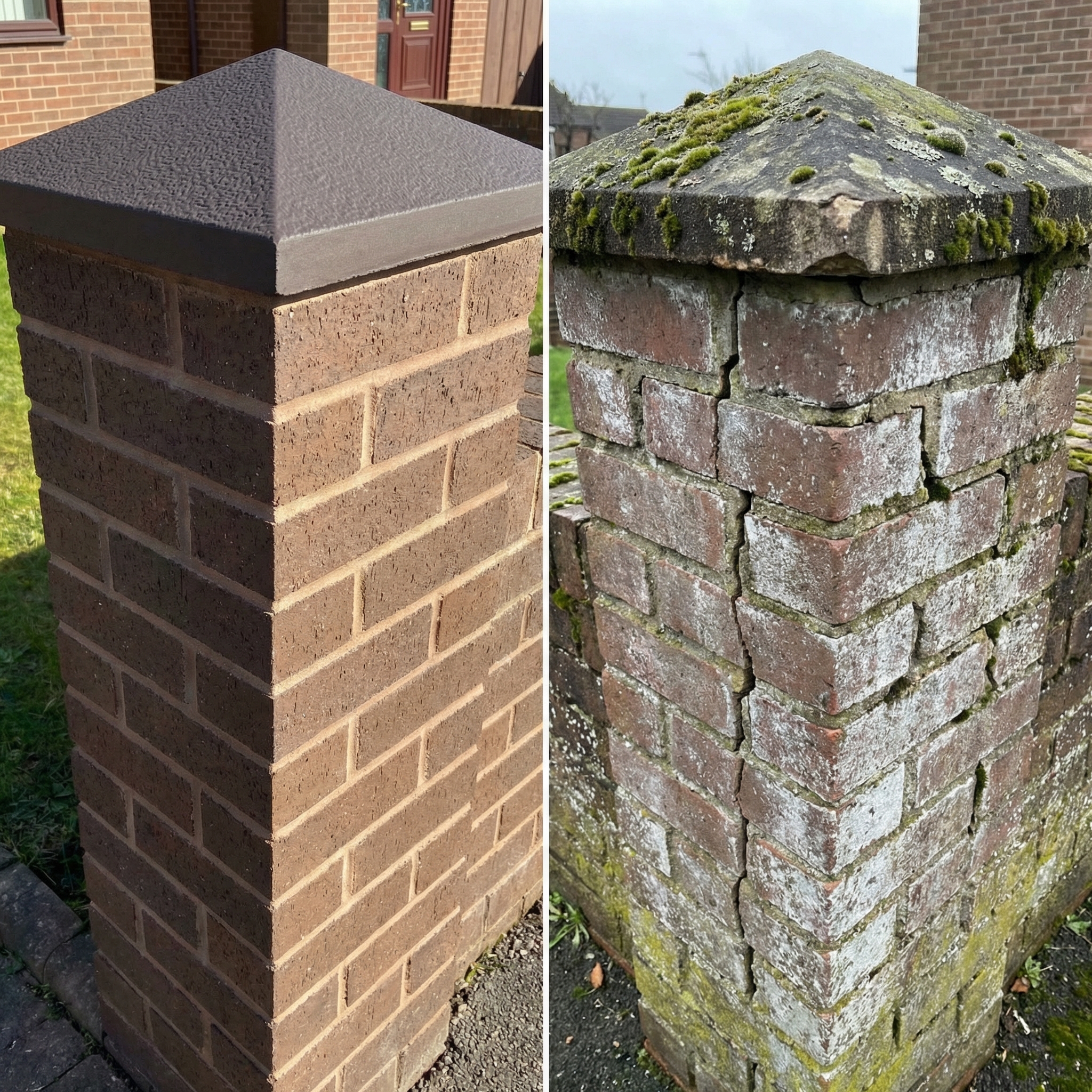 - Разрушение столба. Разрушаясь сам, колпак перестает защищать столб. Вода проникает в кирпичную кладку или бетонный столб, запуская тот же разрушительный процесс уже в основной конструкции.